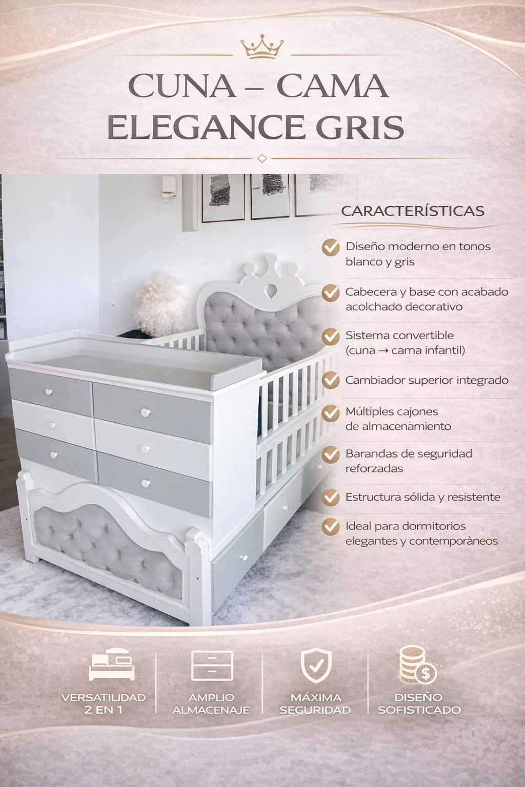✔ Sistema convertible (cuna → cama infantil)